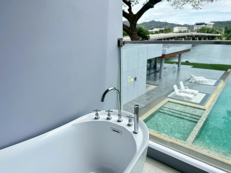 With 40 sqm of thoughtfully arranged space, each room welcomes natural light and opens to a serene view of the River Kwai. Step out onto your private balcony, soak in the outdoor tub, and let the day settle around you.